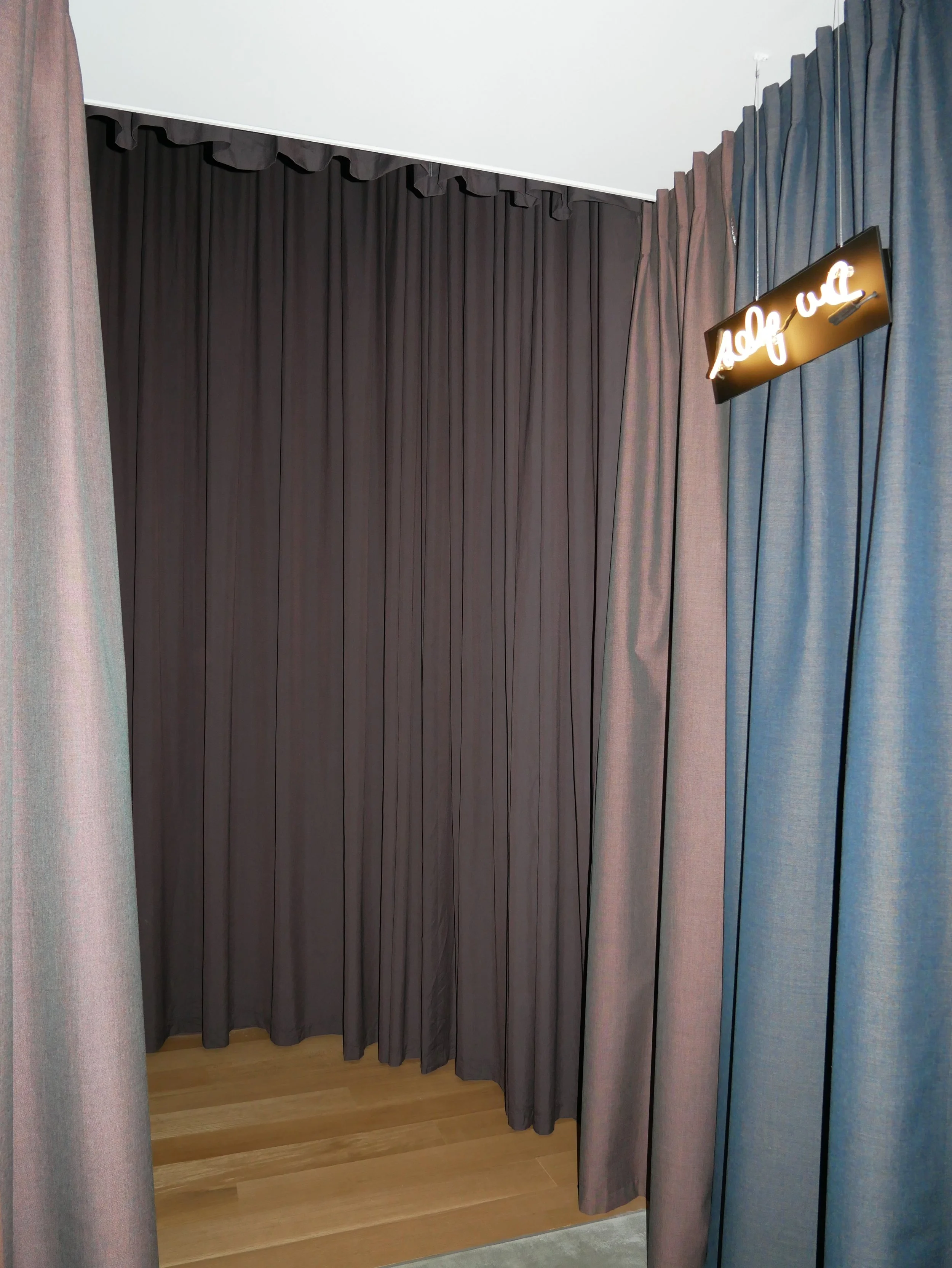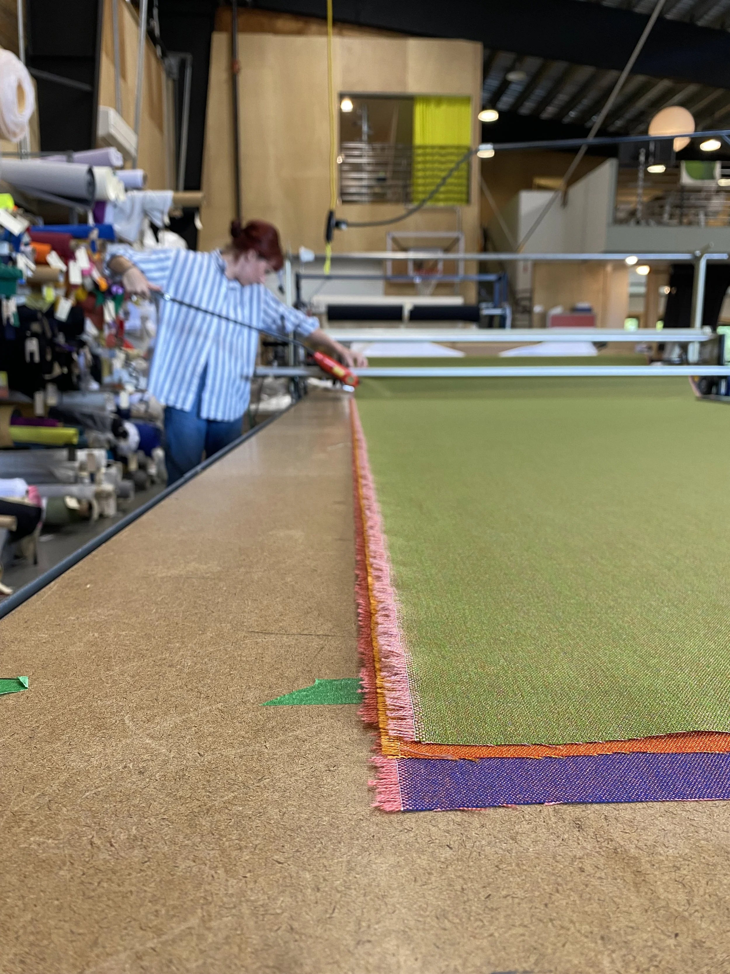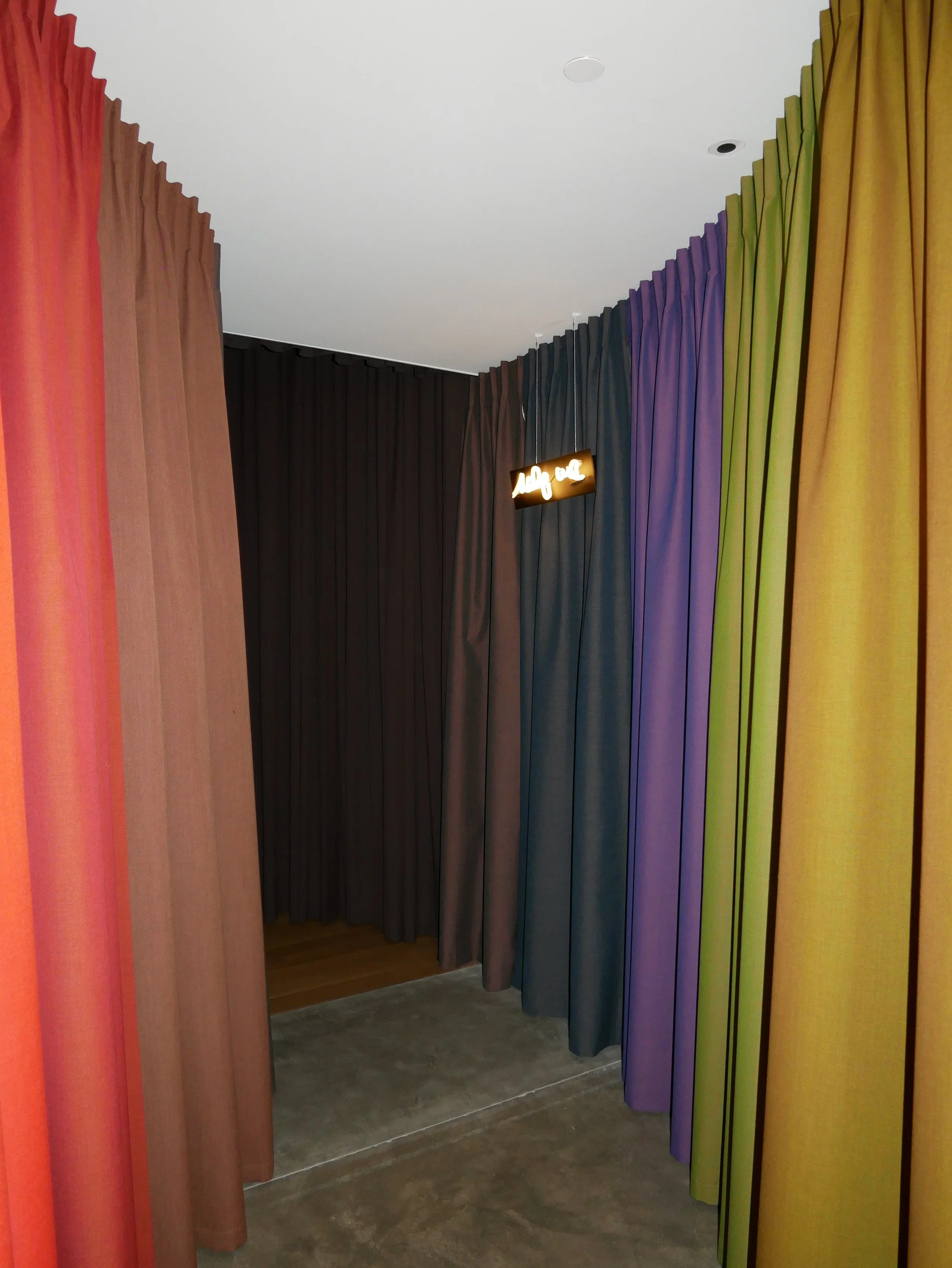 Our team worked closely with Atelier Rist and Portland Art Museum to fabricate, source, and install the custom curtains, beds, cushions, bedding covers, and sound baffling panels that fill this sprawling exhibition. Beginning just outside the exhibition, colorful drapes guide audiences into the space where they transform and flow from floor to ceiling and wall to wall, rippling seamlessly into its water-like environment. Collaborating with our sister company, Oregon Natural Fiber Mill, we filled the exhibition with raft-like beds, cushions, and created durable, long-lasting covers for them. We also produced the sound baffling panels that soften ambient sounds coming from outside the exhibition, maximizing the show’s listening experience. The fabricated elements were the magic touch, offering visitors a soft and inviting place to sink in and float comfortably through Pipilotti Rist’s dreamlike experience.
