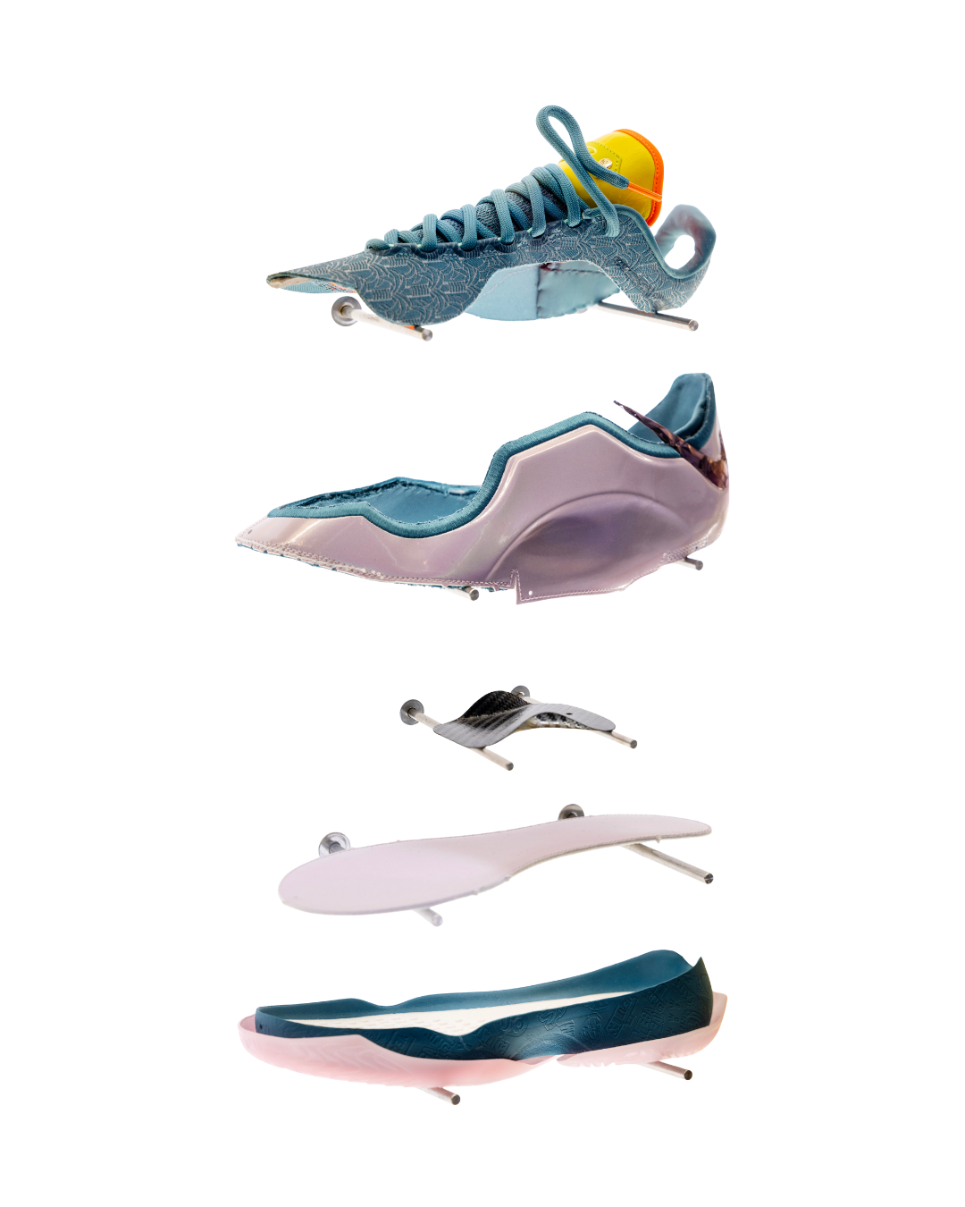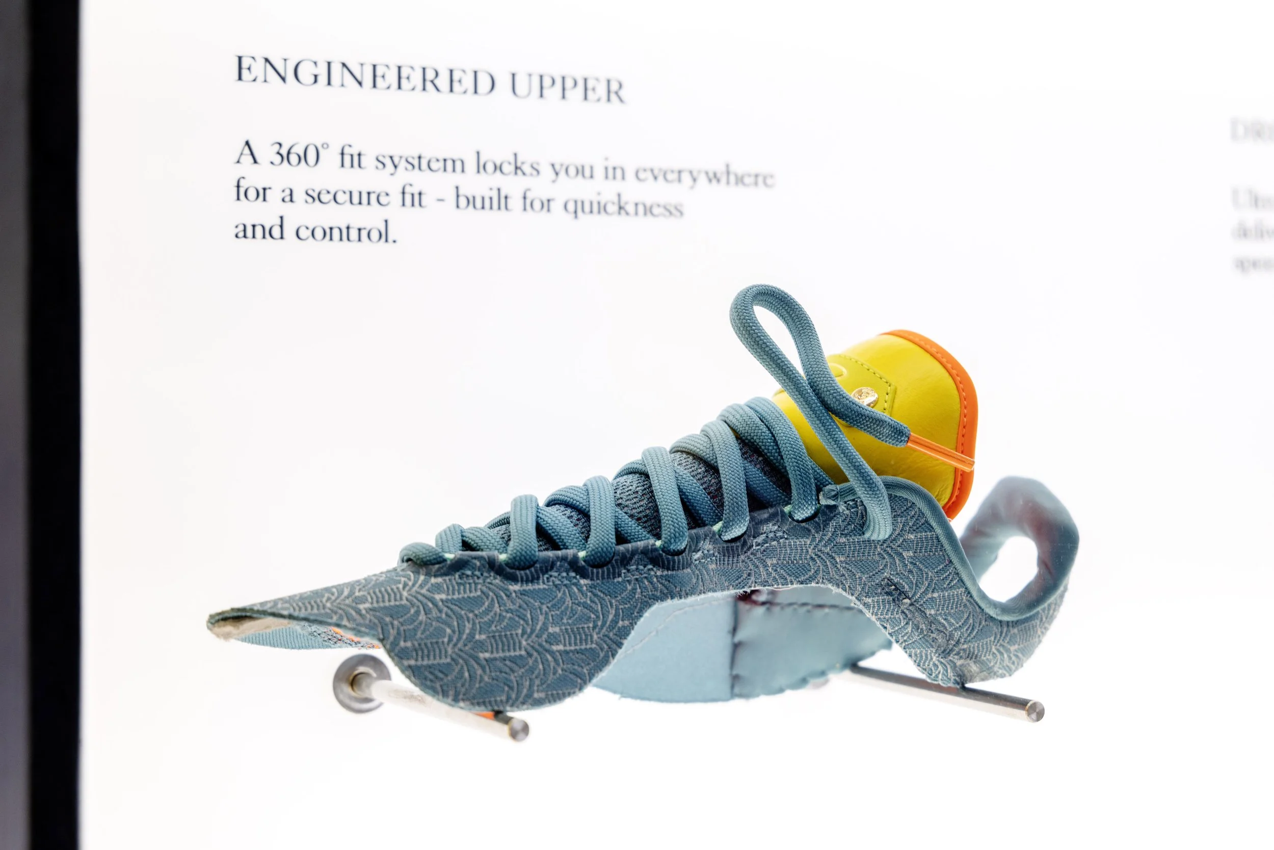 Our team methodically dissected each component, revealing the performance technology and telling a visual narrative. Every cut, edge, and surface was handled with precision: engineered uppers, drop-in midsoles, carbon fiber plates, and the new Crown containment system all on display and set within illuminated cases.